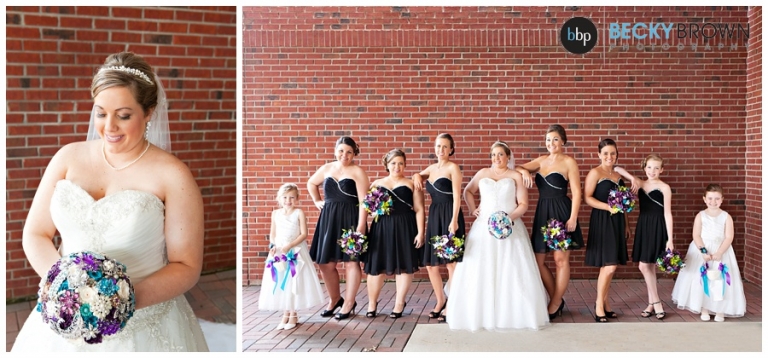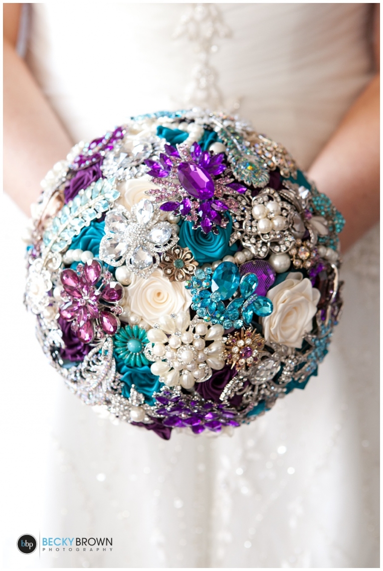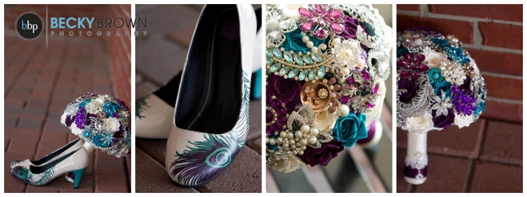 I met the girls at Rumors salon for hair and makeup before heading to the church to shoot details. And the details were amazing 🙂 Amber and friends and family did a lot of the work themselves and pulled off the peacock theme and colors beautifully. Her pin bouquet made of pins from family members was stunning. I can only imagine that her arms were sore in the morning from holding it though as it was the heaviest bouquet I’ve ever seen!